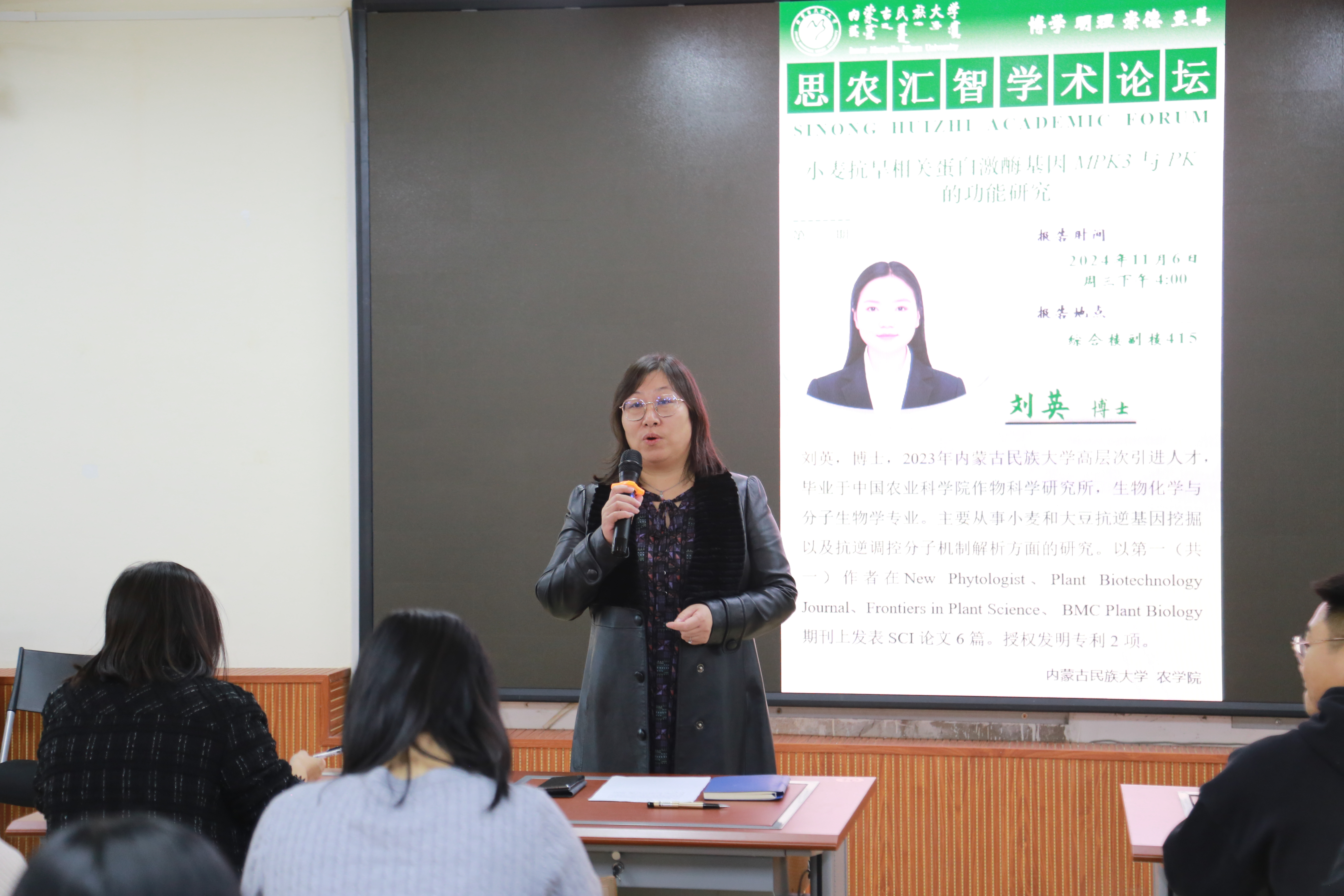11月6日,农学院于明安图楼副楼415举办了第一期“思农汇智学术论坛”,我院智慧农业系青年教师刘英博士应邀做了主题为“小麦抗旱相关蛋白激酶基因 MPK3 与 PK的功能研究”的报告。学院党委书记张晓丽、院长贾俊英、副院长张玉芹以及农学院全体教师和硕士研究生参加会议,会议由贾俊英主持。
