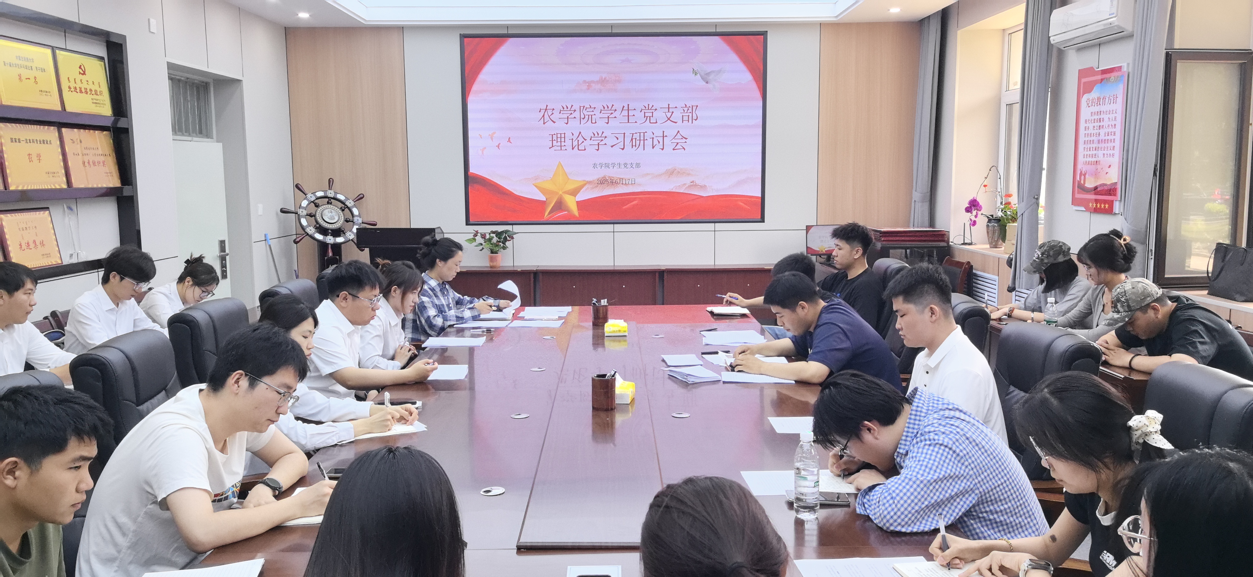 6月17日,农学院学生党支部在农学楼会议室召开理论学习研讨会。支部全体党员参加会议,会议由党支部书记李威主持。