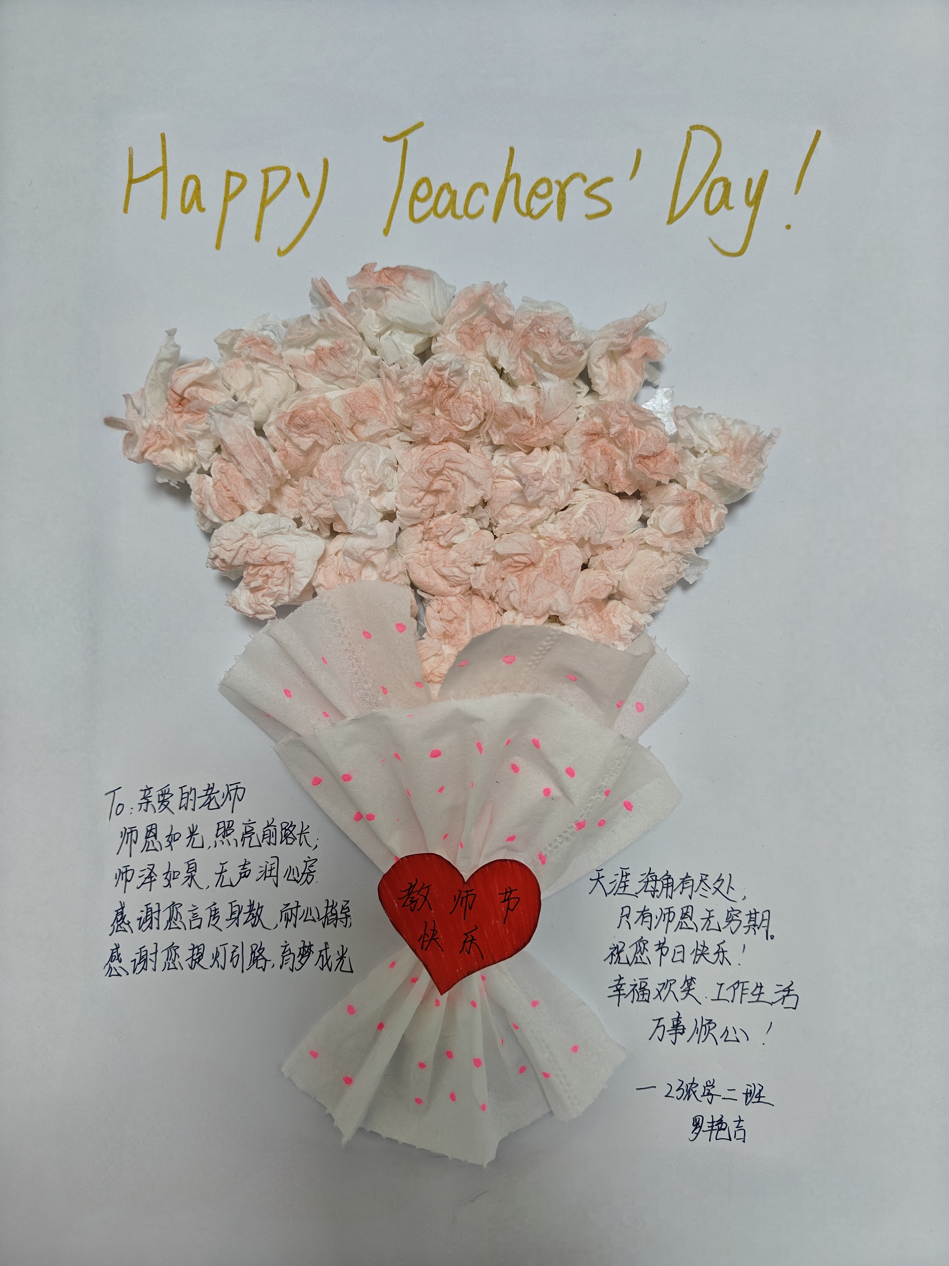 同学们用巧手精心制作每一束花,将对老师的敬意与祝福融入其中。当同学们把饱含深情的手工花束送到老师手中,温暖的互动成为节日里最真挚的风景。