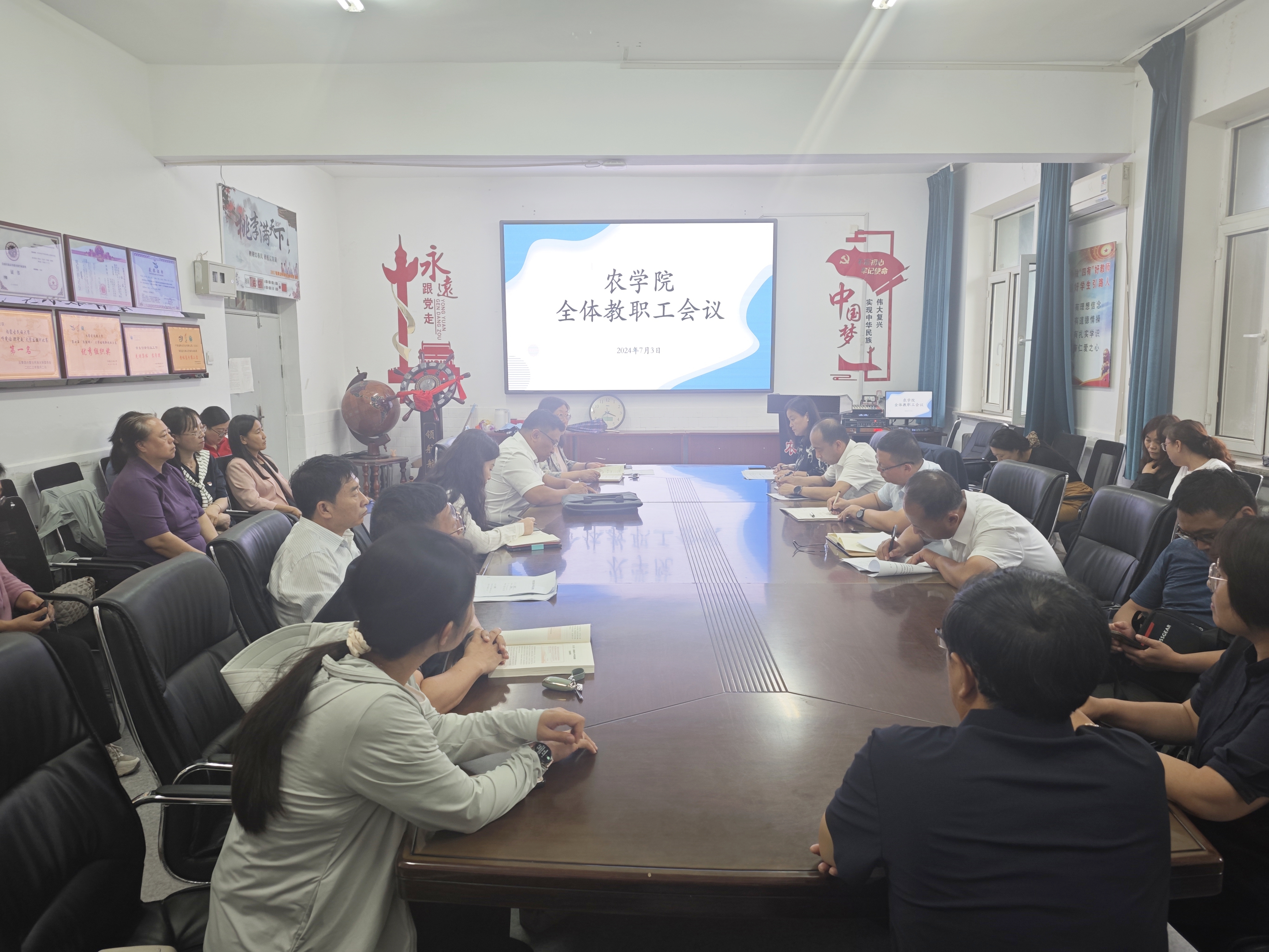 7月3日下午,学院在农学楼110会议室召开全体教职工会议。学院领导班子成员、全体教职工参加会议。会议由学。院党委书记张晓丽主持。