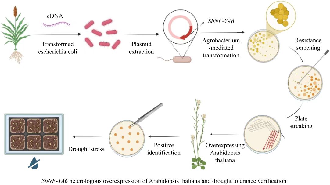 该研究阐述了高粱NF-YA基因家族的结构特征和表达差异,并利用植物转基因的方法将SbNF-YA6基因异源过表达至拟南芥,对其耐旱性进行了初步验证。结果表明:在干旱胁迫下转基因拟南芥的表型、生长情况和生理生化指标等均优于野生型。后续通过验证拟南芥下游耐旱基因的相对表达水平,发现在干旱胁迫下AtCAT1、AtABI4、AtDREB2A、AtNCED3和AtP5CS1这5个基因的转录表达水平在转基因拟南芥各株系中均显著高于野生型,说明SbNF-YA6的过表达增强了拟南芥的抗旱性。该研究为理解高粱NF-YA家族基因的进化及其在遗传改良中的潜在作用提供了新的思路,也为通过传统育种技术和现代生物技术途径利用应激响应NF-YA基因作为高粱遗传改良的潜在候选者提供了基础。