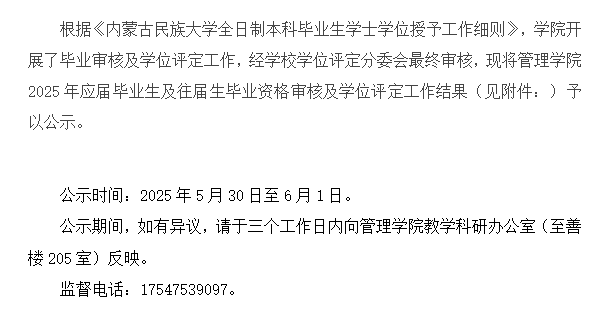 管理学院2025年应届毕业生及往届毕业生资格审查及学位评定公示