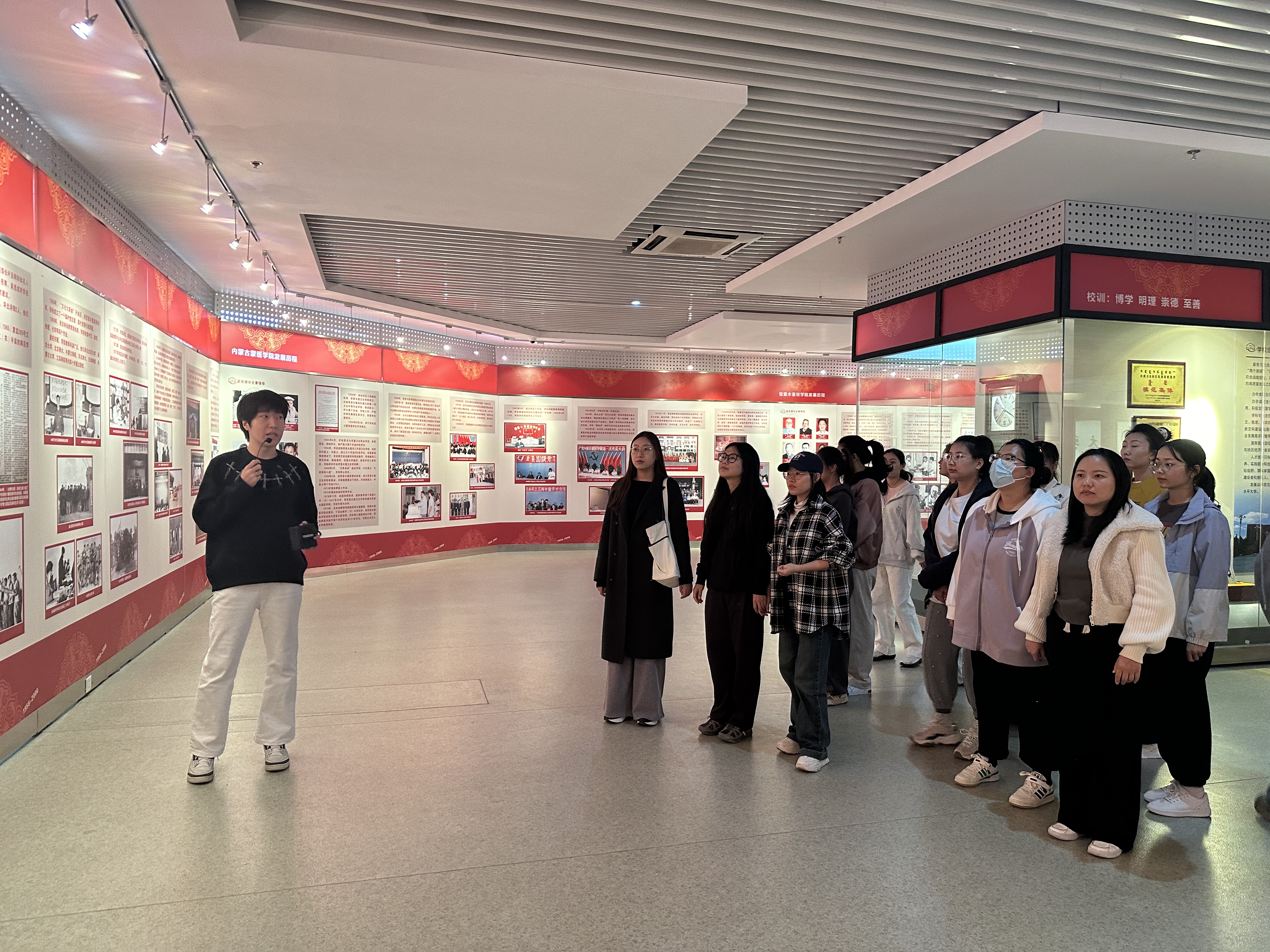 学生们满怀期待地走进校史馆,在讲解员的带领下,依次参观了校史馆、蒙医药馆和西辽河历史文明展厅。他们仔细聆听着讲解员的介绍,认真观看了每一张历史照片,深刻感受到了学校从创立至今的辉煌历程。在参观过程中,新生们了解了学校的发展历程、办学理念,深切地体悟到了学校独有的办学特质和在人才培养、科学研究、社会服务等领域取得的成就。