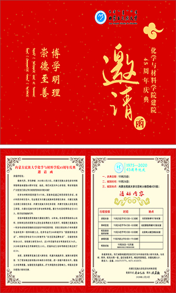 春秋代序,岁月峥嵘。2020年11月25日,内蒙古民族大学化学与材料学院将迎来建院45周年华诞。在此,我们向区内外心系母校、情系学院的广大校友们致以节日的祝贺和亲切的问候!