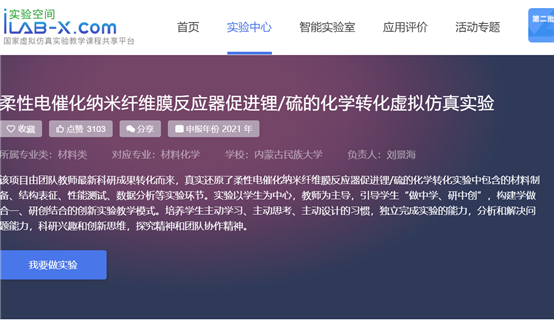 柔性电催化纳米纤维膜反应器促进锂/硫的化学转化 (网址连接:http://www.ilab-x.com/details/2020?id=6302&isView=true) | 虚拟仿真实验课程 | 刘景海 |