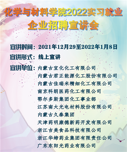 化学与材料学院于2021年12月29日-2022年1月8日,为2022届毕业生组织企业线上宣讲周活动。