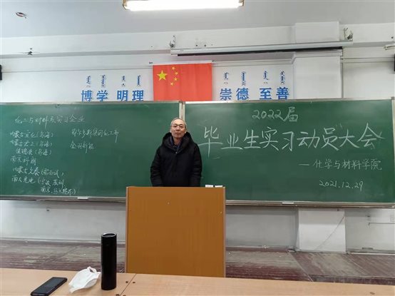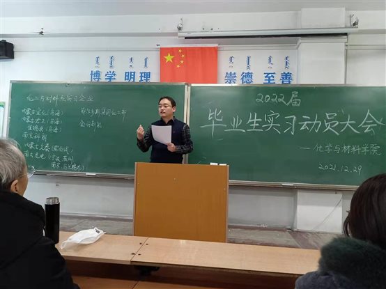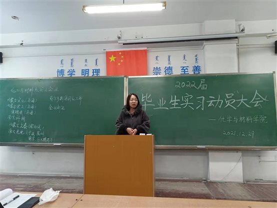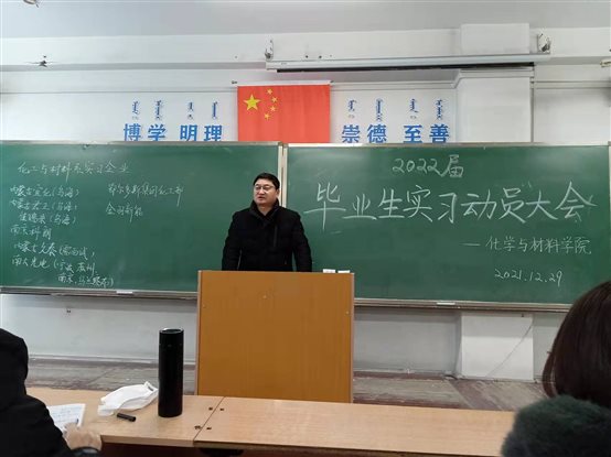 2021年12月29日中午,我院2022年度非师范专业毕业实习动员大会在理工楼129举行。会议由刘景海副院长主持。学院党委书记吴白乙拉、院长段莉梅、副书记昭日格图及材料化学、应用化学和化学工程与工艺相关专业负责人、毕业班班主任和全体毕业生参加了本次会议。