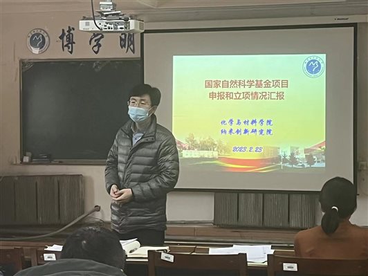 2023年2月23日上午,化学与材料学院和纳米创新研究院在树人楼501会议室召开了2023年国家自然科学基金项目申报论证会,学院拟申报项目的近20名教师参会交流。会议由学院院长段莉梅教授主持。学校科技处副处长张苏亚拉图教授到会指导。