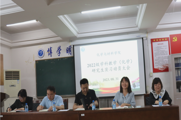 8月24日和31日,化学与材料学院于树人楼召开了2022级学科教学(化学)研究生实习动员大会,学院党委书记格日勒图、院长刘景海、副书记喜杰、副院长宋娟娟、专硕学科带头人徐玲教授及全体22级学科教学(化学)研究生和导师参加会议。会议由喜杰主持。