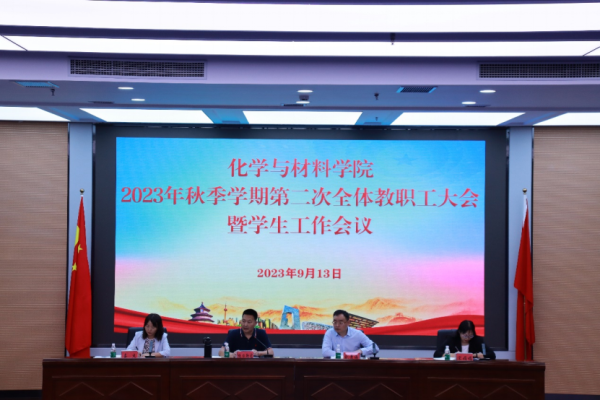 9月13日下午,化学与材料学院于图书馆大报告厅召开2023年秋季学期第二次全体教职工大会暨学生工作会议,学院党委书记格日勒图、院长刘景海、副书记喜杰、副院长宋娟娟及全体教职工参加会议。会议由格日勒图主持。