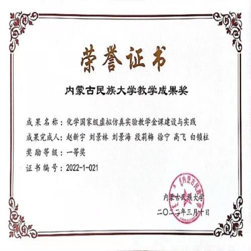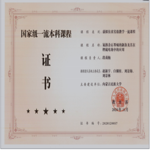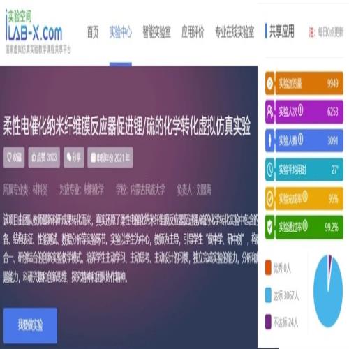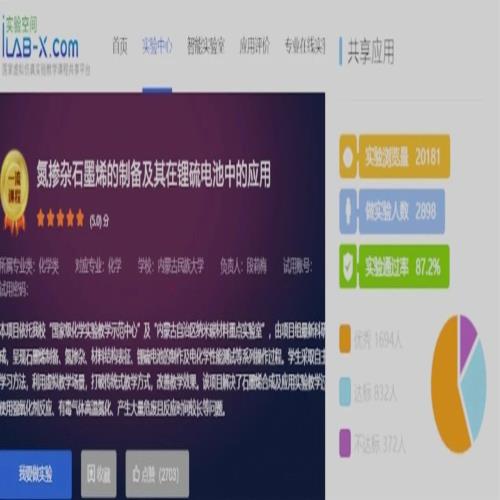 建设“一流引领、内容创新、铸魂育人”虚拟仿真实验课程,构建一流虚拟仿真实验课程体系,科学推进线上/线下混合式教学改革,实施“学科、专业、课程一体化” 实验教学理念,探索科研成果转化教学资源的有效途径,引入虚拟仿真实验教学,构建“立体化、情景化、互动化”的化学实验新体系,嵌入学科前沿, 打造“声像结合” 课程思政元素有效融入实验教学新模式。基于教师科研成果凝练的“氮掺杂石墨烯的制备及其在锂硫电池中的应用”和“柔性电催化纳米纤维膜反应器促进锂/硫的化学转化”两项虚拟仿真实验教学项目分别在2020年和2021年获批“国家一流本科课程”和“自治区一流本科课程”。两项虚拟仿真实验教学项目在国家虚拟仿真实验教学课程共享平台(ilab-x实验空间)共享,实验人数均在3000人左右、实验浏览量分别超万次。