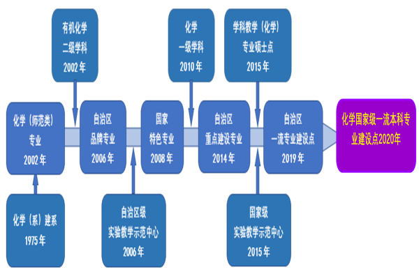 专业是人才培养的基本单元,是建设高水平本科教育、培养一流人才的“四梁八柱”。应用型本科高校要结合办学特色努力建设一流专业。“十四五”期间,学院以师范类专业和工程教育专业认证为契机,持续推进专业内涵建设,落实立德树人根本任务,培养扎根祖国北疆、面向全国,专业技能扎实、实践能力强、综合素质高、德智体美劳全面发展的应用型人才。其中,2020年,化学专业入选国家级一流本科专业建设点、材料化学专业为自治区级品牌专业,2022年,化学专业接受教育部师范类专业第二级认证专家线上集中考查,2023年,教育部正式发布化学专业第二级认证通过通知。学院将进一步发挥认证专业示范引领作用,全面落实“学生中心、产出导向、持续改进”的理念,扎实推动师范类专业特色发展、追求卓越,积极谋划参加第三级专业认证,助力学校内涵式高质量发展,为中国式现代化建设培养更多高素质专业化创新型教师。注重加强学生专业素养和学风建设,我院化学专业毕业生考研率平均达40%以上,毕业生初次就业率达到80%以上,为铸牢中华民族共同体意识、服务祖国北疆教育事业、提升民族地区化学专业人才素质发挥了重要作用。