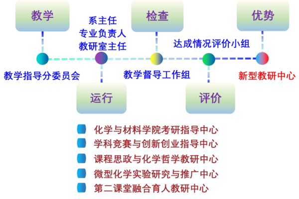 学院始终秉承“以学生为中心、以产出为导向”的现代高等教育理念,以毕业生毕业要求达成、课程目标达成、培养目标达成作为化学各专业人才培养质量保障,在学校以教务处、学生处、学校教学督导等为主体所构建的校级教学质量保障体系基础上,为促进学院各项教学工作正常有序运行及其教学管理的规范化、科学化与信息化,逐步提升课程教学质量,保障各项制度措施的顺利实施,及时发现和解决教学工作中存在问题,依据学校制定的二级学院作为教学单位实施主体的教学管理模式与管理思想,较为系统地构建和完善了化学与材料学院“以学生为中心、以产出为导向、进行持续改进”的教学质量保障体系以及课程教学过程常态化内部监控机制。加强基层组织建设,建立“五位一体”的教学管理体系,成立5个以学生发展为中心的新型教研中心,有效提升课程教学质量。