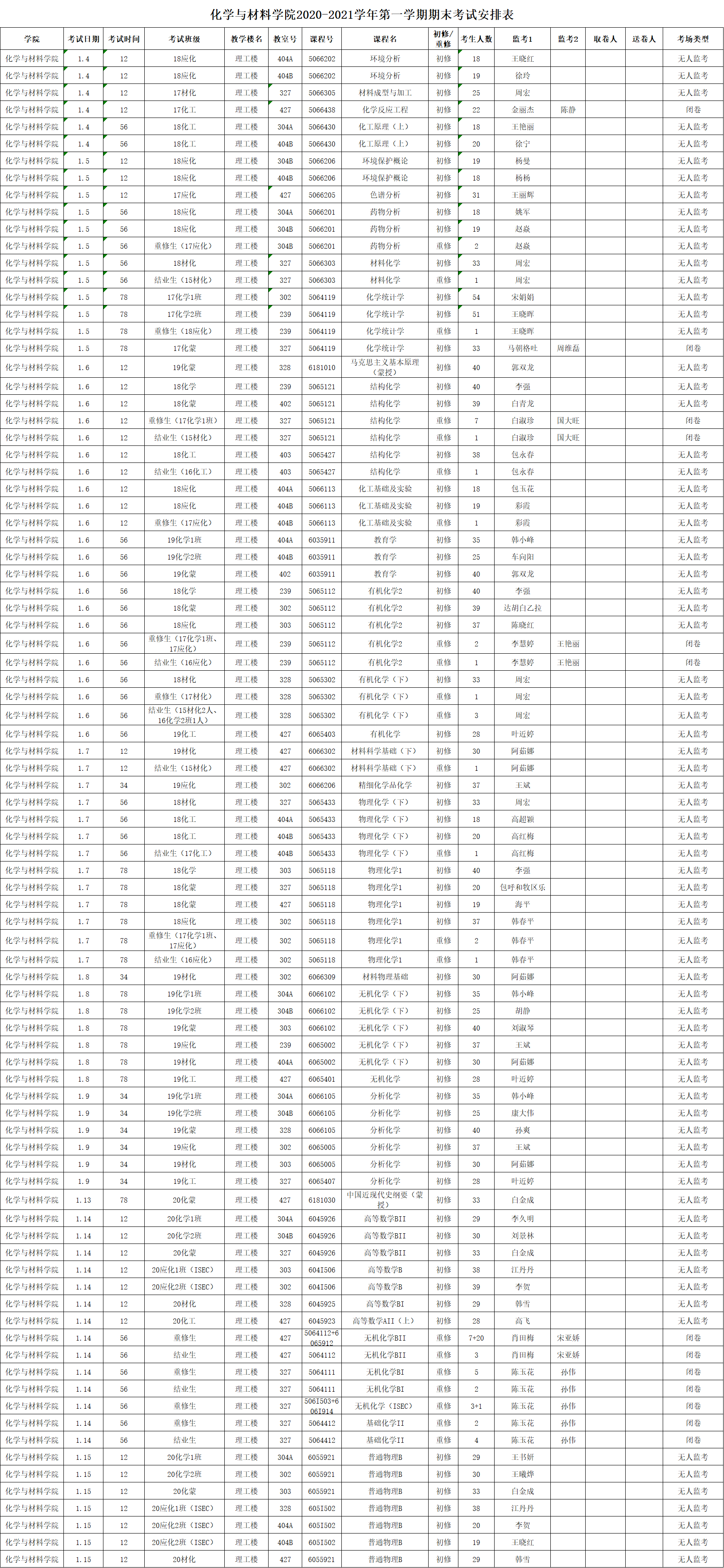 化学与材料学院-2020-2021学年第一学期期末考试安排汇总表