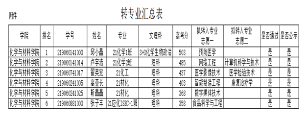 根据《内蒙古民族大学学生转专业管理办法(试行)》的有关规定和学校《关于2021级学生转专业的通知》的要求,经学生申请、学院教务办审核、学院党政联席会通过,同意2021级邱小晶等6名同学由在读专业转出。现将拟转出学生名单予以公示,公示时间为2021年12月28-12月30日。