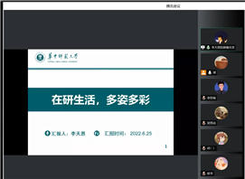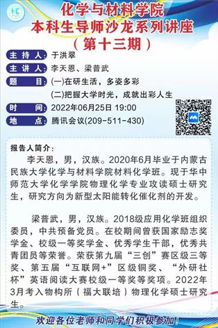 化学与材料学院于2022年6月25日晚19:00通过腾讯会议平台举办了第十三期本科生导师沙龙活动,会议邀请了李天恩(16级材料化学)和梁普武(18级应用化学)两位优秀学生代表分别分享了他们大学和研究生的多彩生活。学院老师和学生共计100余人参加了本次活动,于洪翠老师主持会议。