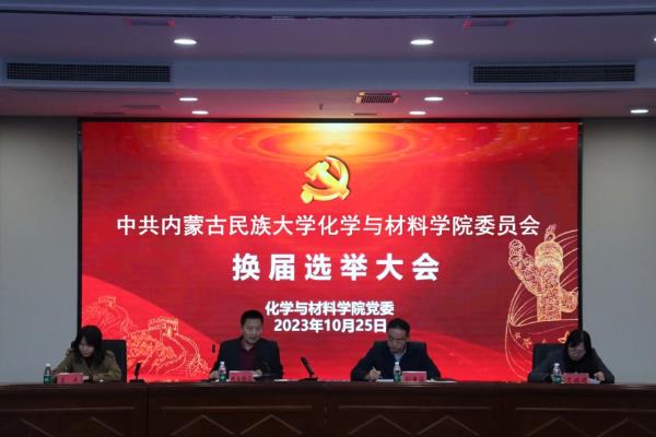 根据《中国共产党章程》《中国共产党普通高等学校基层组织工作条例》《中国共产党支部工作条例(试行)》《中国共产党基层组织选举工作暂行条例》的有关要求,按照校党发【2023】41号《关于做好基层党组织选举工作的通知》的安排部署,10月25日下午,中共内蒙古民族大学化学与材料学院委员会换届选举大会在图书馆小报告厅胜利召开。学院党委书记格日勒图、院长刘景海、副书记喜杰、副院长宋娟娟及党员近110余人出席大会。会议由学院党委书记格日勒图主持。
