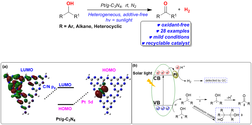 光催化氧化技术作为一种绿色、可持续、高效的氧化技术,可用于有机小分子醇的催化转化。传统的醇氧化方法需要在氧化剂且加热的条件下才能促使反应进行,本研究中,该团队建立了一种温和、高效的光催化氧化醇脱氢制备酮类化合物的方法。该方法以铂负载的氮化碳(Pt/g-C3N4)作为光催化剂,在N2气氛中,室温条件下即可光催化醇脱氢制备相应的酮类化合物(其中乙腈作为溶剂时,转化率97%,选择性99%; 水作为溶剂时,转化率72%,选择性98%),H2作为唯一的副产物通过气相色谱确定。通过自由基捕获实验和DFT理论计算,揭示该反应的反应机理为Pt介导的双电子空穴氧化机理,α-醇自由基为重要的中间体。在最优条件下,供电子和吸电子取代的醇均能顺利的转化为相应的目标化合物,转化率58-99 %,选择性89-99%。催化剂的稳定性测试显示,催化剂循环利用五次后,催化活性没有明显降低,显示催化剂稳定性较好。此方法实现了温和、无氧条件下醇脱氢制备酮类化合物。