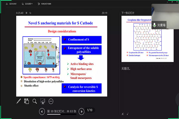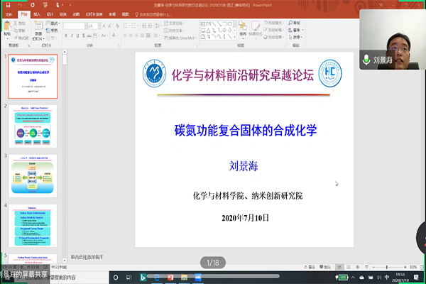 7月10日晚上7点,第五期化学与材料前沿研究卓越论坛如期举行,这次报告会是本学期化学与材料前沿研究卓越论坛的最后一期。我院车向阳博士和副院长刘景海教授在腾讯会议分别作了题为《超分子有机凝胶的结构、性质及应用研究》和《碳氮功能复合固体的合成化学》的线上学术报告。学院部分教师、研究生和本科生共计60余人在线聆听了报告,报告会由刘景海教授主持。