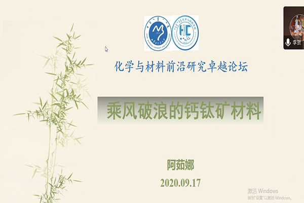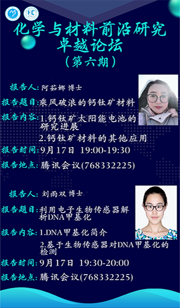 9月17日晚上7点,庆祝化学与材料学院建院(系)45周年系列学术活动暨化学与材料前沿研究卓越论坛第六期如期举行,我院阿茹娜博士和纳米创新研究院的刘雨双博士在腾讯会议分别作了题为《乘风破浪的钙钛矿材料》和《利用电子生物传感器解析DNA甲基化》的线上学术报告。学院部分教师、研究生和本科生共计60余人在线聆听了此次学术报告,报告会由副院长刘景海教授主持。