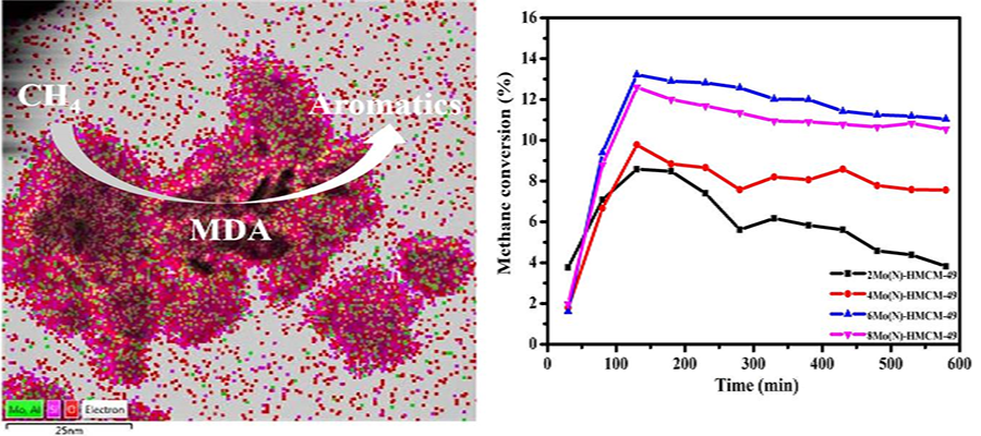 在甲烷直接转化方法中,将甲烷无氧脱氢芳构化(MDA)转化为高附加值芳烃(即苯、甲苯和萘等)是甲烷增值的有效途径。本研究中,我们采用纳米MoO3作为Mo源,微孔分子筛 MCM-49作为载体制备双功能Mo基催化剂,研究结果表明纳米MoO3高度分散在分子筛内部,与分子筛中的Brönsted酸中心结合形成活性中心MoCx物种,有效改善甲烷无氧脱氢芳构化反应的催化活性,提高催化剂的稳定性。在甲烷无氧脱氢芳构化反应测试中,纳米MoO3的负载量为6 wt. %时,Mo/MCM-49催化剂表现的甲烷转化率达到13.2%,芳烃产率可达9.1%。本研究为合成高性能、稳定的MDA催化剂提供了一种更为简易的策略。