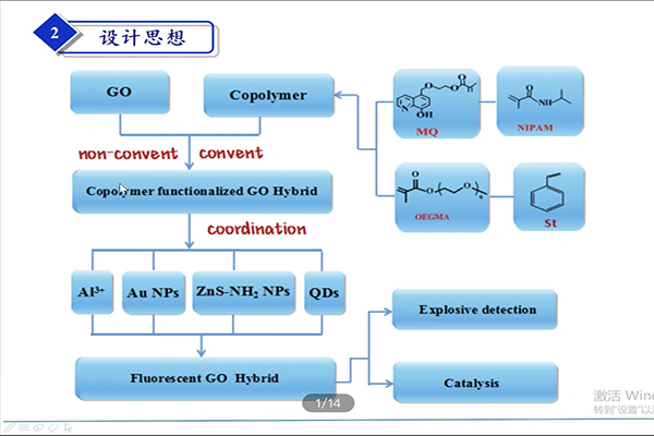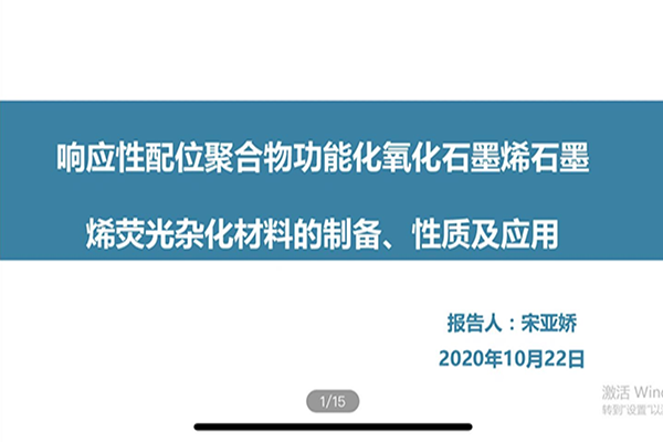 报告会上,宋亚娇博士对响应性聚合物功能化氧化石墨烯荧光杂化材料的制备方法进行了介绍,尤其对荧光杂化材料的性质及杂化材料在荧光检测等领域的应用进行了详细的讲述。汇报结束后,宋亚娇博士针就主-客体识别作用功能化氧化石墨烯的方法和老师们进行了交流讨论。