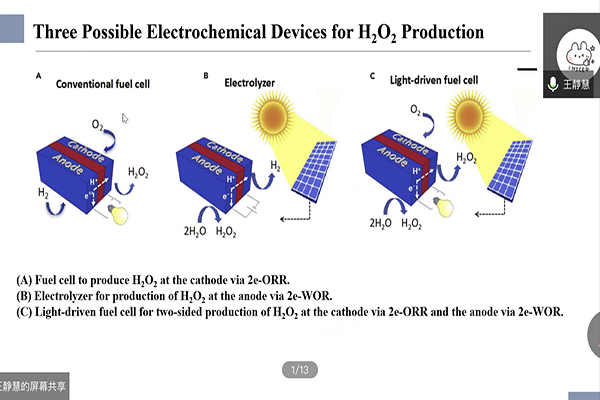 随后,王静慧硕士就光催化及电催化产过氧化氢研究进展做了简要介绍,首先介绍了光催化产过氧化氢近年来研究成果,包括材料的选择与合成,材料的后期修饰。基于电极材料和电解液的选择,溶液pH的调节,器件设计等方面介绍了电催化产过氧化氢的研究进展。最后,详细介绍了目前用于过氧化氢的常用检测方法。在交流讨论后,本次报告会圆满结束。