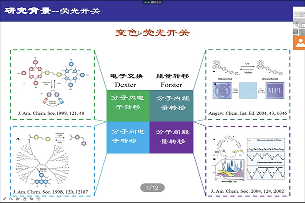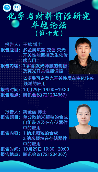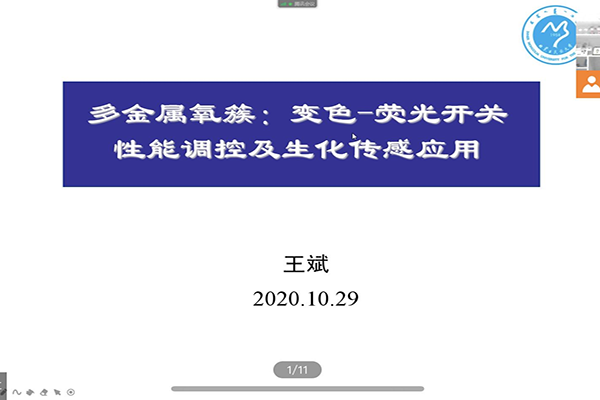 10月29日晚上7点,庆祝化学与材料学院建院(系)45周年系列学术活动暨化学与材料前沿研究卓越论坛第十期如期举行,我院王斌博士和纳米创新研究院胡全丽博士在腾讯会议分别作了题为《多金属氧簇:变色-荧光开关性能调控及生化传感应用》和《单分散纳米颗粒的合成自组装以及在存储器件中的应用》的线上学术报告。学院部分教师、研究生和本科生共计50余人在线聆听了此次学术报告,报告会由副院长刘景海教授主持。