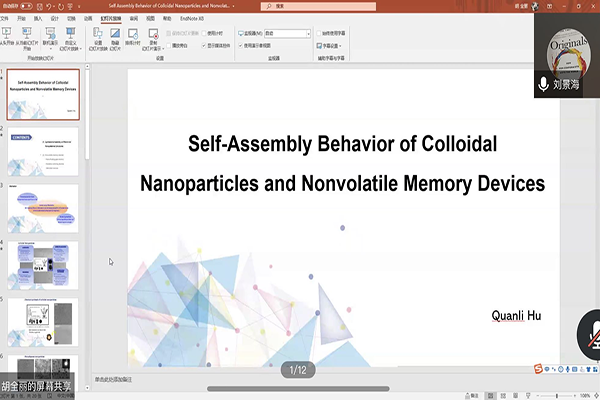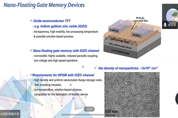 随后,胡全丽博士就纳米颗粒的合成、自组装以及在非易失性存储器件中的应用做了介绍。首先介绍了单分散胶体纳米颗粒的合成、纳米颗粒自组装成薄膜以及在纳米模板中自组装。详细讲解了纳米颗粒在纳米浮栅存储器、阻变存储器以及忆阻器中的研究进展。