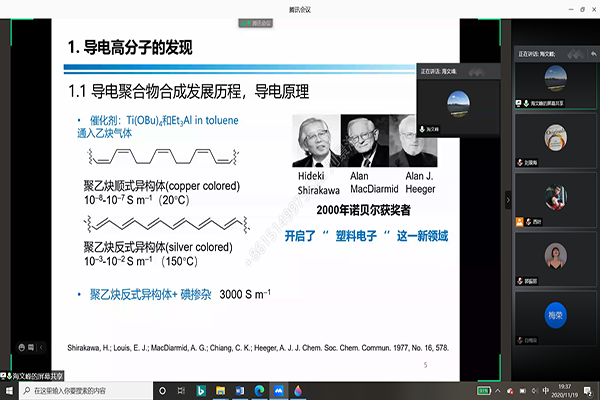 11月19日晚上7点,庆祝化学与材料学院建院(系)45周年系列学术活动暨化学与材料前沿研究卓越论坛第十三期如期举行,我院王曦烨博士和纳米创新研究院的海文峰博士在腾讯会议分别作了题为《蒙药的代谢组学研究》和《用于生物电子,生物传感的功能聚(3,4-乙烯基二氧噻吩)(PEDOT)衍生物》的线上学术报告。学院部分教师、研究生和本科生共计50余人在线聆听了此次学术报告,报告会由副院长刘景海教授主持。