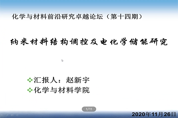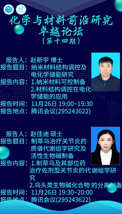 11月26日晚上7点,庆祝化学与材料学院建院(系)45周年系列学术活动暨化学与材料前沿研究卓越论坛第十四期如期举行,我院赵新宇博士和纳米创新研究院的赵佳迪硕士在腾讯会议分别作了题为《纳米材料结构调控及电化学储能研究》和《制草乌治疗关节炎的质谱代谢组学研究及活性生物碱制备》的线上学术报告。学院部分教师、研究生和本科生共计50余人在线聆听了此次学术报告,报告会由副院长刘景海教授主持。