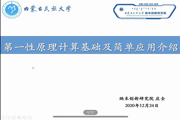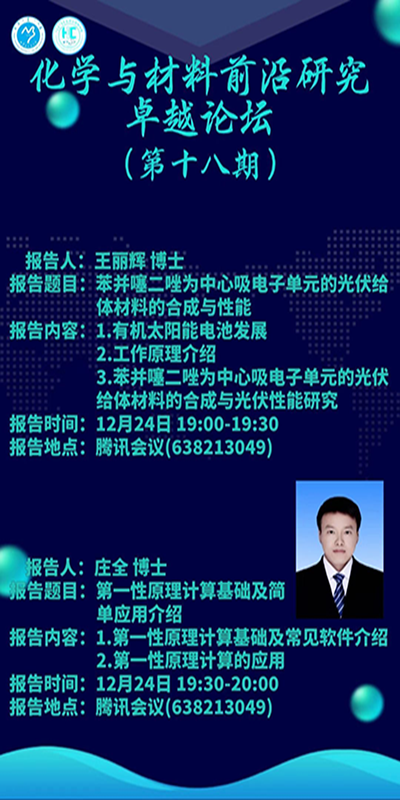 12月24日晚上7点,庆祝化学与材料学院建院(系)45周年系列学术活动暨化学与材料前沿研究卓越论坛第十八期如期举行,我院王丽辉博士和纳米创新研究院的庄全博士在腾讯会议分别作了题为《苯并噻二唑为中心吸电子单元的光伏给体材料的合成与性能》和《第一性原理计算基础及简单应用介绍》的线上学术报告。学院部分教师、研究生和本科生共计50余人在线聆听了此次学术报告,报告会由副院长刘景海教授主持。
