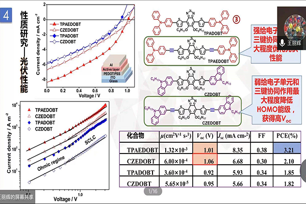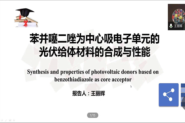 报告会上,王丽辉博士就有机太阳能电池的发展和工作原理以及基于苯并噻二唑为中心吸电子单元的有机小分子的光伏性能进行了介绍,重点对其博士期间合成的基于苯并噻二唑为中心吸电子单元有机小分子的结构和光伏性能进行了探讨。她还就老师们提出的该类分子是否可以应用于有机传感材料等问题进行了交流。
