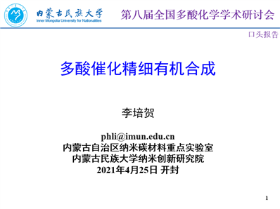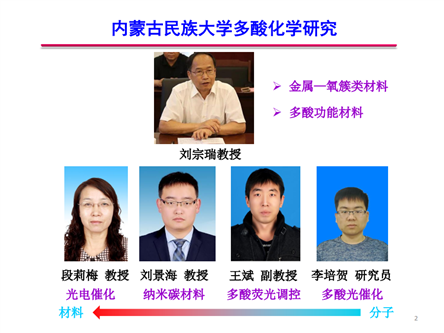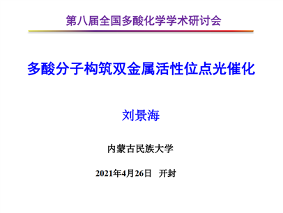 我院段莉梅教授、刘景海教授、王斌副教授受邀出席会议,刘景海教授担任多酸能源化学的分会主持人。刘景海教授和李培贺研究员分别做邀请报告《多酸分子构筑双金属活性位点光催化》和口头报告《多酸催化精细有机合成》。刘景海教授深入浅出的介绍从POMs分子到POMs材料的构建,受到与会者的热烈讨论。李培贺研究员从多酸催化有机反应领域为大家分享了工作。本次多酸学术研讨会将促进我院多酸科研合作与创新,推动我院多酸化学与材料的发展。