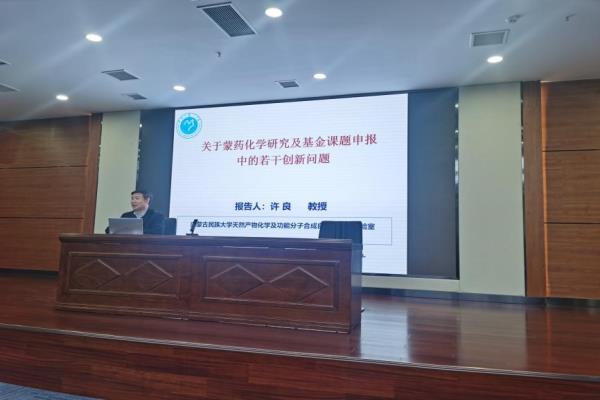 许良教授做题为《关于蒙药化学研究及基金课题申报中的若干创新问题》的学术报告。许良教授从蒙药化学研究问题的提出、常见的课题申报选项以及关于基金申报中的若干问题等方面进行了讲解。并就蒙药与中药的区别等问题与同学们进行了讨论。