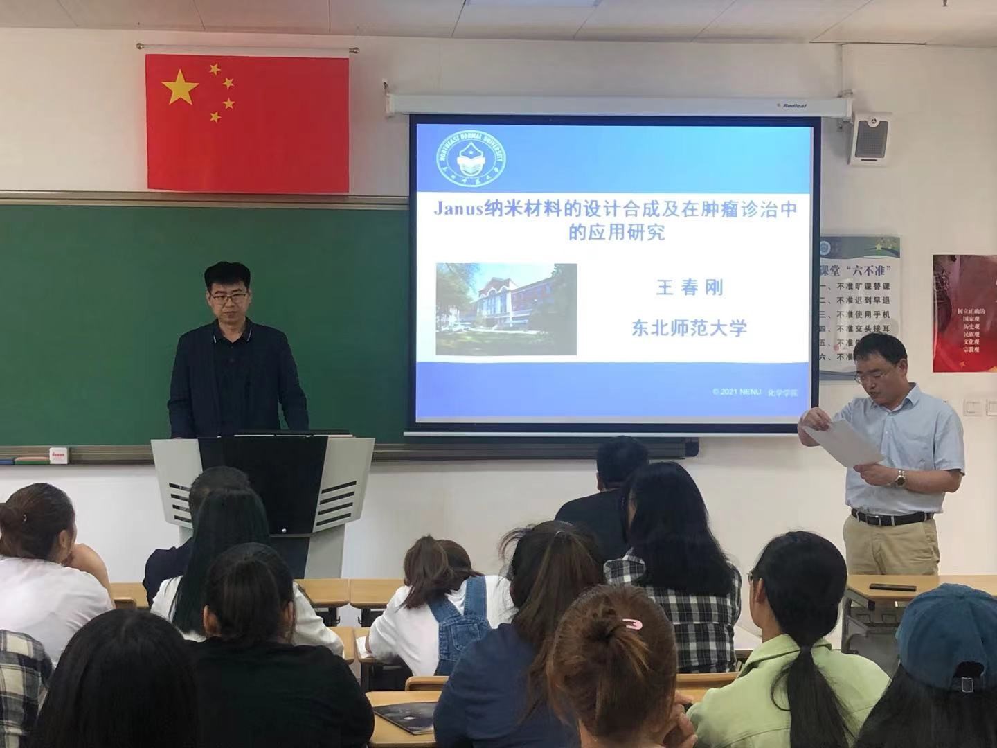 为庆祝建党100周年,2021年5月29日,东北师范大学王春刚教授与黑龙江大学田春贵教授应邀参加化学与材料学院系列活动之前沿学术讲座,在蒙医药楼208分别作了学术报告。化学与材料学院、纳米创新研究院的部分教师、研究生与本科生参加了本次学术报告,报告会由副院长刘景海主持。