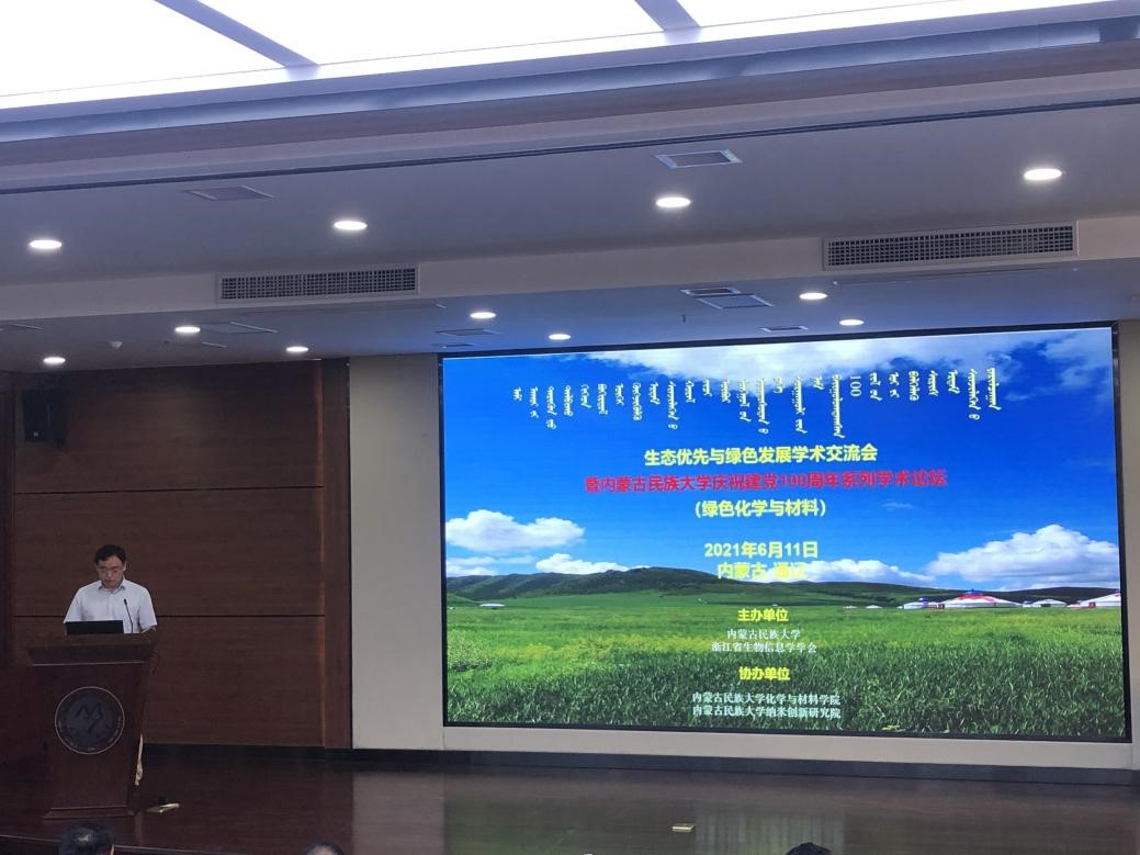 在喜迎建党100周年之际,为切实树立绿色发展理念,明确生态文明建设主题地位,进一步加大科技创新和技术推广,促进各相关学科的交流、交叉与融合,内蒙古民族大学和浙江省生物信息学学会联合主办 “生态优先与绿色发展学术交流会”暨内蒙古民族大学庆祝建党100周年系列学术论坛,本次“绿色化学与材料”论坛于2021年6月11日在我校图书馆小报告厅召开,由化学与材料学院和纳米创新研究院联合承办。内蒙古民族大学党委委员、副校长杨恒山教授出席并致辞,浙江省生物信息学会理事长、浙江大学陈铭教授讲话并宣布会议开幕,学校科技处处长裴志利教授,生命科学与食品学院院长田迅教授等领导受邀参会,化学与材料学院和纳米创新研究院的部分教师、研究生和本科生近90人参加了此次会议。