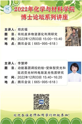 12月3日下午,2022年化学与材料学院博士论坛系列讲座(第一期)在腾讯会议线上举行,我院郑庆福博士和李慧婷博士分别作了学术报告,学院部分教师和研究生共计60余人参加了报告会。报告会由院长段莉梅教授主持。