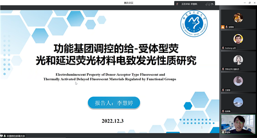 李慧婷博士所作报告的题目为《功能基团调控的给-受体型荧光和延迟荧光材料电致发光性质研究》,她简要介绍了有机电致发光器件的研究历程及发光机理,结合自己的研究课题,阐述了通过改变功能基团的种类、取代位置、给受体种类,分子给体和受体间的扭曲程度和空间构型,以及分子内电荷转移强度等因素调控荧光材料光电性质的研究思路与研究进展。
