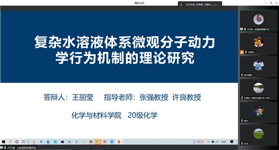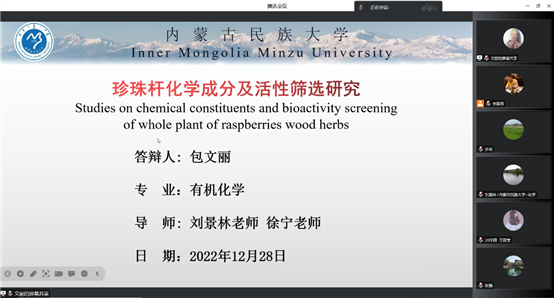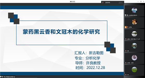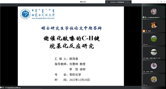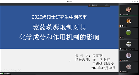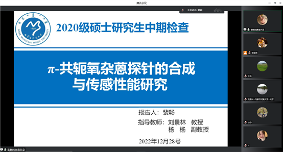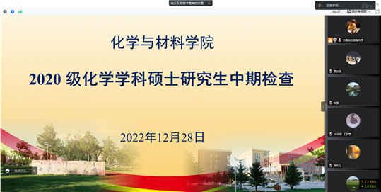 2022年12月28日上午,我院2020级化学学科有机分析组硕士研究生进行了中期检查汇报,会议顺利结束。本次中期检查利用腾讯会议平台在线上进行,化学与材料学院数十名硕士研究生和硕士生导师在云端远程参会。