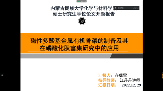 2022年12月29日下午,我院2021级化学学科有机分析组硕士研究生进行了开题报告,会议顺利结束。本次开题报告利用腾讯会议平台在线上进行,化学与材料学院数十名硕士研究生和硕士生导师在云端远程参会,会议由学院刘景林教授主持。