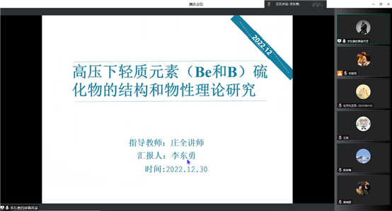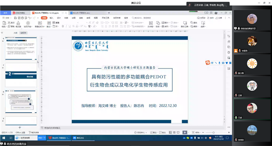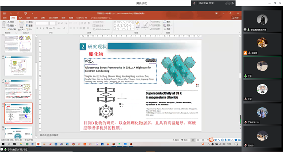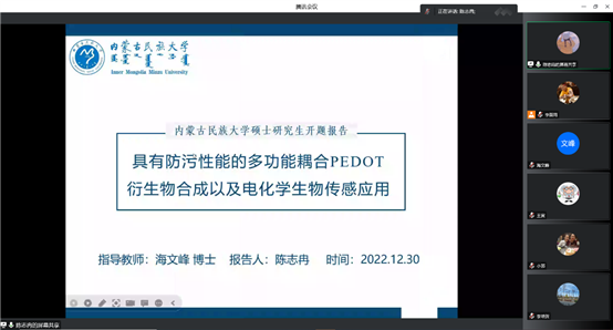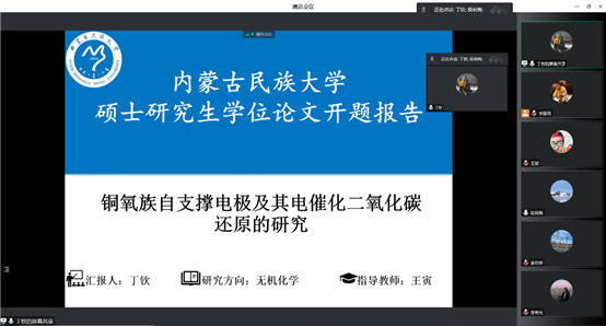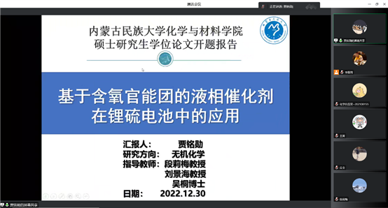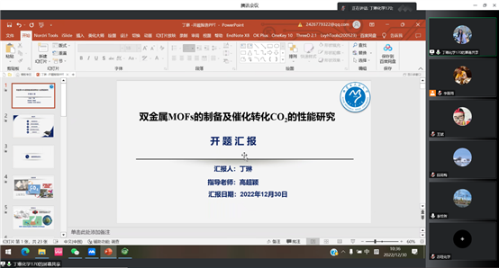 2022年12月30日上午,我院2021级化学学科无机物化组硕士研究生进行了开题报告,会议顺利结束。本次开题报告利用腾讯会议平台在线上进行,化学与材料学院数十名硕士研究生和硕士生导师在云端远程参会,会议由学院王寅和李培贺两位老师主持。