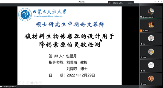 刘景海教授首先介绍了中期检查的要求,指出这次中期检查主要是给同学们提出修改建议,为接下来的毕业答辩以及论文盲审质量把关。参加中期检查的10位研究生围绕自己所研究的领域及研究成果进行了汇报