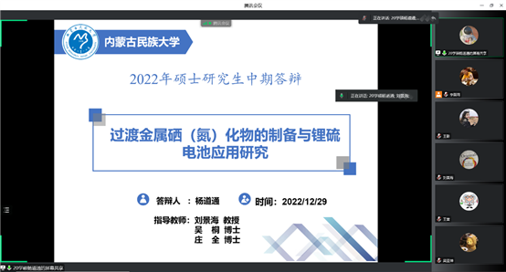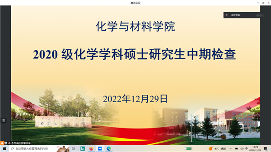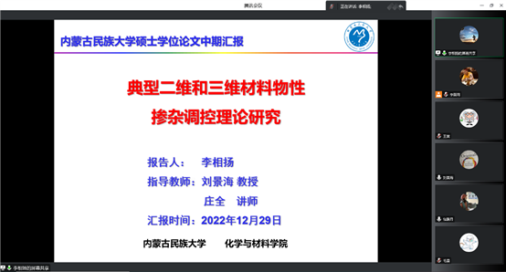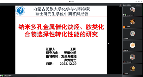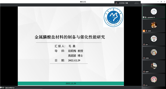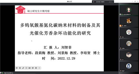 2022年12月29日下午,我院2020级化学学科无机物化组硕士研究生进行了中期检查,会议顺利结束。本次中期检查利用腾讯会议平台在线上进行,化学与材料学院数十名硕士研究生和硕士生导师在云端远程参会,会议由学院副院长刘景海教授主持。
