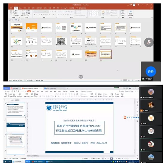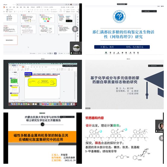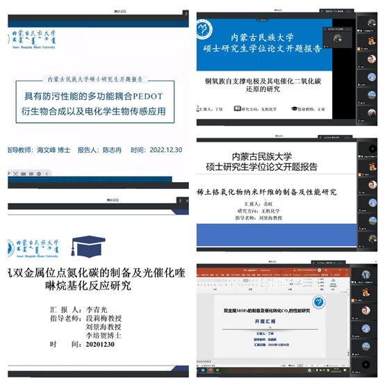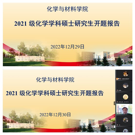 2022年12月29日下午和30日上午,我院2021级化学学科硕士研究生分两组进行了开题报告会,本次开题报告利用腾讯会议平台在线上进行,学院60余名研究生硕士研究生和硕士生导师在云端远程参会,汇报会分别由刘景林教授、王寅博士和李培贺博士3位老师主持。
