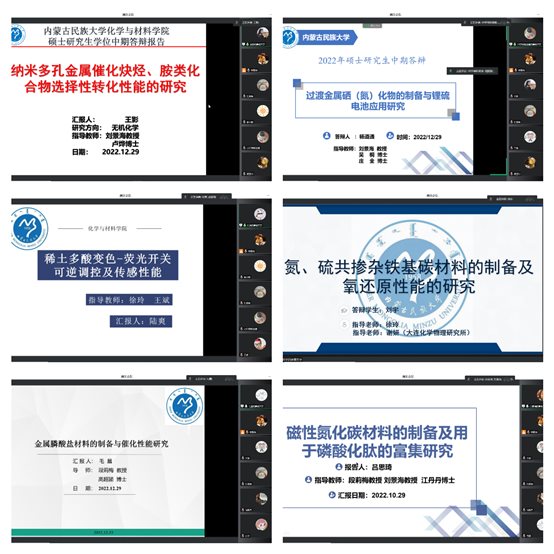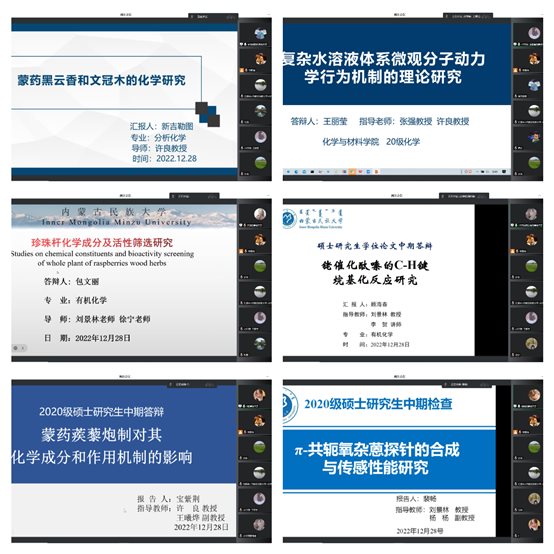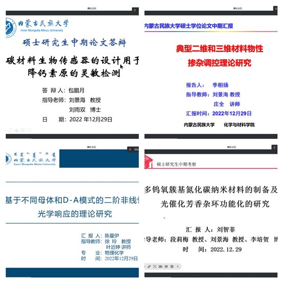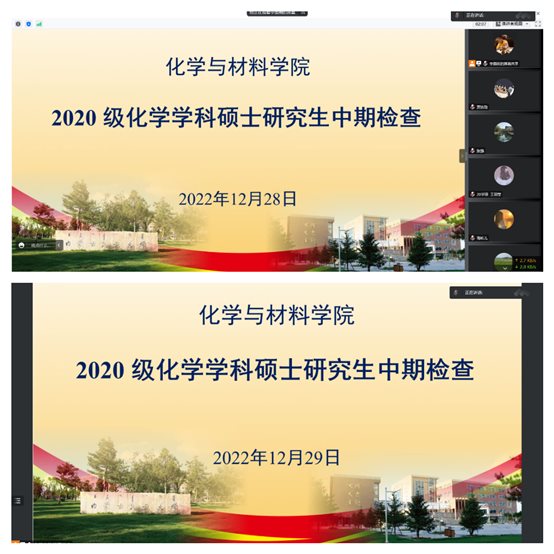 2022年12月28日上午和29日下午,我院召开了2020级化学学科硕士研究生学位论文中期检查汇报会。本次中期检查利用腾讯会议平台分两组在线上进行,学院全体化学学科硕士研究生和硕士生导师在云端远程参会,两组会议分别由学科方向带头人刘景林教授和学院副院长刘景海教授主持。