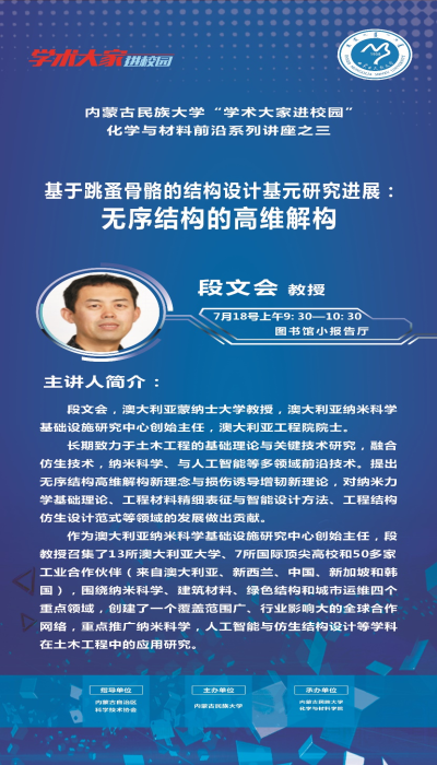 内蒙古民族大学“学术大家进校园”化学与材料前沿系列讲座是依托化学与材料学院搭建的学术交流品牌,旨在邀请国内外知名的专家学者和科学家莅临我校进行学术交流,激发青年教师学术思维火花,提升学科专业和人才培养成效,推进教育、科技、人才“三位一体”战略支撑,服务学校高质量发展。