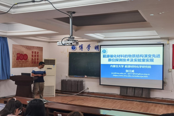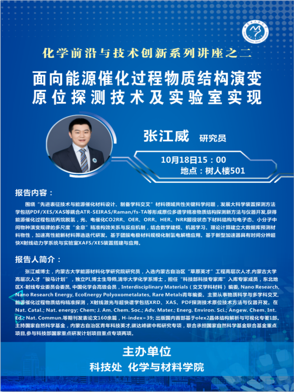 张江威研究员围绕“先进表征技术与能源催化材料设计、制备学科交叉”材料领域共性关键科学问题,发展大科学装置探测方法学包括PDF/XES/XAS等耦合ATR-SEIRAS/Raman/fs-TA等形成原位多谱学精准物质结构探测新方法与仪器开发,获得能源催化过程包括丙烷脱氢,光、电催化CO2RR、OER、ORR、HER、NRR服役状态下材料结构与电子态、小分子中间物种演变规律的多尺度“全息”精准构效关系与反应机制,结合数学建模、机器学习、理论计算建立大数据库预测材料物性,加速高性能新材料筛选送代研发。基于团簇电极材料规模化制氢电解槽应用。基于新型加速器具有时间分辨超快X射线动力学系统与实验室XAFS/XES装置搭建与应用。 本次活动是化学与材料学院举办的化学前沿与技术创新系列讲座之二,该系列讲座对我院的科学研究、平台建设、学术交流与人才培养起到积极的促进作用。